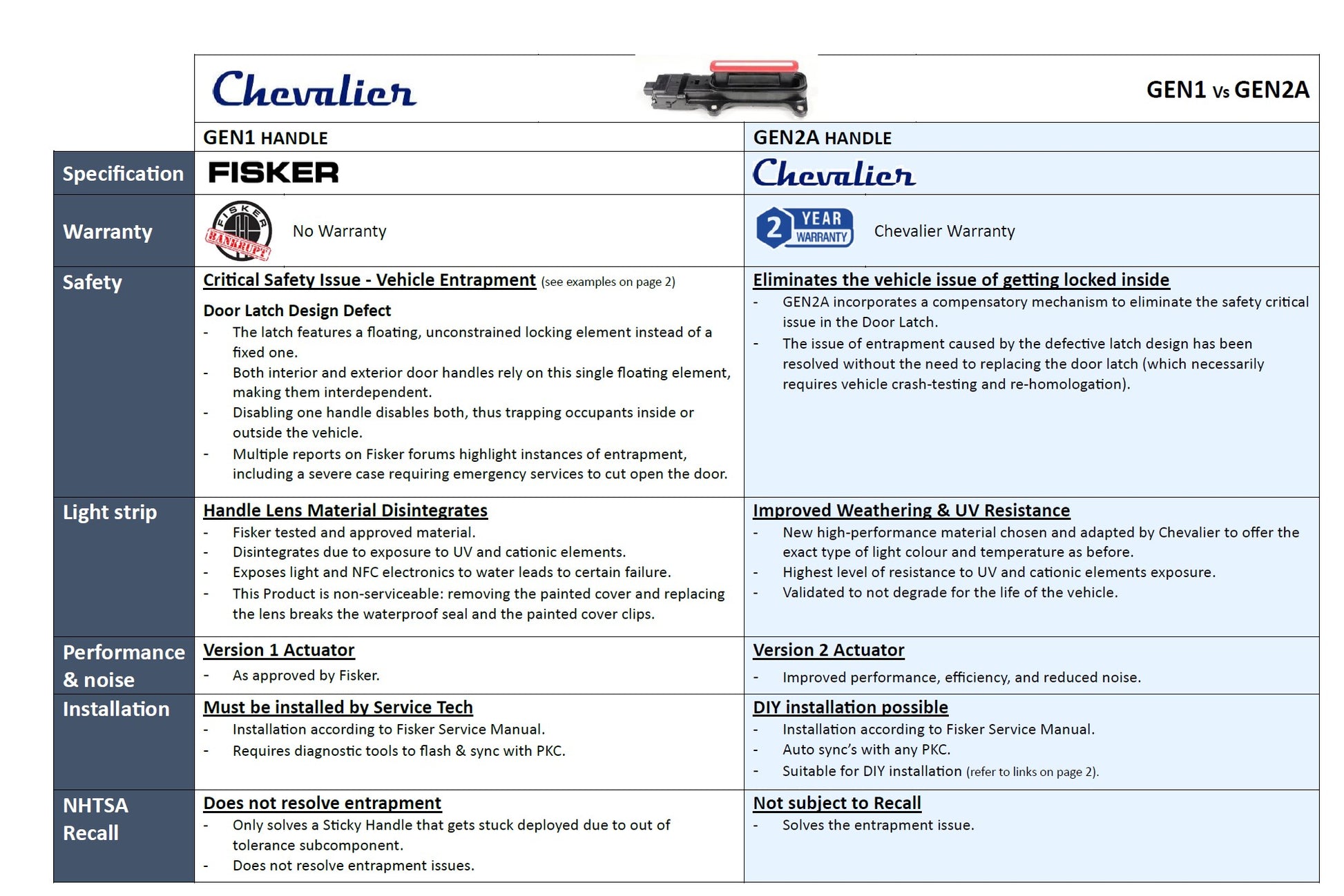 These door handles are the newest model from Chevalier LTD, and include the following improvements over previous generation, including the door handles provided by Fisker Inc. in fulfillment of NHTSA recall orders: