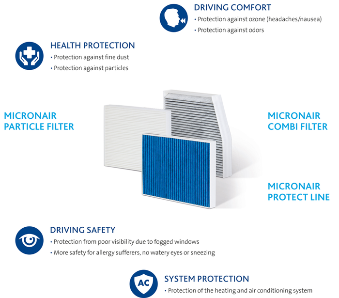 The cabin air filters of the micronAir proTect line offer drivers and passengers the best possible protection inside the vehicle. In addition to the advantages of the particle and combi filter, this premium cabin air filter reliably and lastingly captures nearly 100 percent of fine dust, virtually 100 percent of all allergens ≥ 2 µm and mold microspores present in the air flow. The micronAir proTect line is based on a new type of material design with four filter layers that combine various filter properties. For instance, synthetic fibers of various sizes capture the coarse to ultra-fine dust particles. The reliable adsorption of odors and gases is achieved by the activated carbon layer. The allergen protection is ensured by a functional layer that very efficiently and lastingly denatures the allergens. Additives free of nano-silver ions with high long-term stability and scientifically shown to be safe for humans are used in the layer.